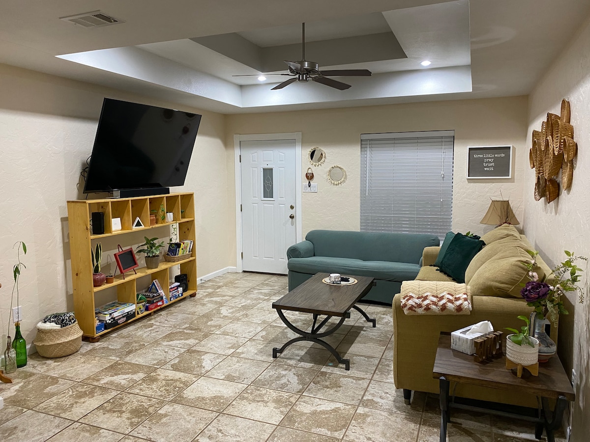 Elegante casa de huéspedes con ubicación céntrica a pocos minutos de todo en Texarkana. El espacio magníficamente limpio y tranquilo está cerca de ambos hospitales, Target, Walmart, cines y restaurantes, pero sigue estando en un barrio extremadamente seguro, por lo que es perfecto para descansar y recargar energías. Con todos los muebles nuevos, ropa de cama de lujo de colección de hotel, televisores de 55" y 65" y bar de bebidas, ven a relajarte en este hogar bien equipado lejos de casa. ¡Ven y permítenos mostrarte por qué realmente somos el doble de agradables!