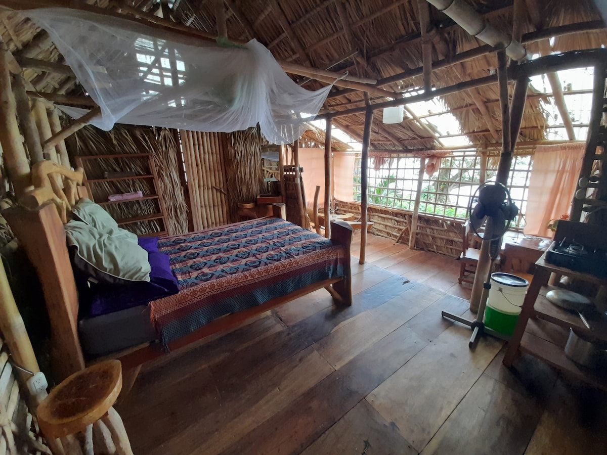 Cabaña en Finca la Magia Eco Jungle Guest House y Organic Farm Restaurant. Una habitación sencilla pero hermosa en la planta superior, hecha de bambú y con vistas al lago Cocibolca, el volcán Maderas y la exuberante selva Ometepe. Está amurallado abierto y tiene un mosquitero (¡rara vez mosquitos!) y una ducha ecológica en la selva al aire libre.