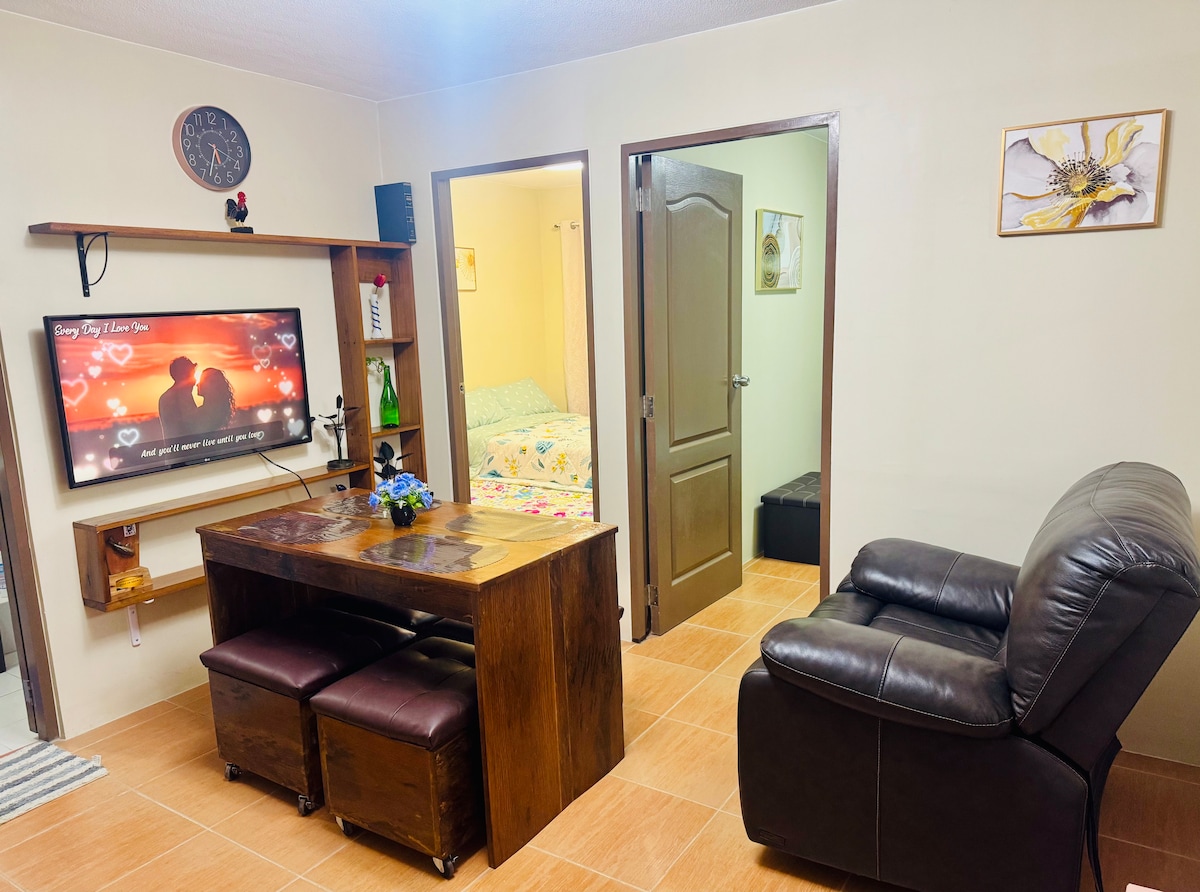 Disfruta de un elegante y acogedor apartamento de un dormitorio en Uptown Cagayan de Oro - Con TV de 50 pulgadas con Netflix y Youtube. - Baño reformado con bañera, ducha de efecto lluvia fría y caliente. - Apartamento totalmente climatizado (aire acondicionado tipo split de 1,5 hp en la sala de estar y de tipo ventana de 1 hp en el dormitorio). - con electrodomésticos y utensilios de cocina en funcionamiento (cocina eléctrica de 4 quemadores, microondas, hervidor eléctrico, ollas arrocera). - Con libros que puedes leer. - Juegos de mesa a los que puedes jugar. - Piscina cubierta situada en la misma planta.