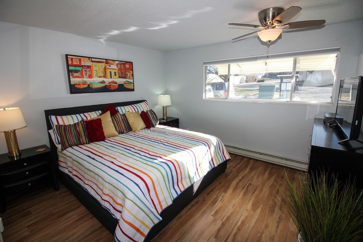 Nuevo apartamento tipo estudio (sótano) en el centro histórico de Grand Junction, ¡a pocos pasos de todo! Superlimpio. Entrada privada. Acabados de lujo; aire acondicionado, encimeras de granito en una gran cocina surtida, baño grande con ducha de azulejos/vidrio y suelos radiantes, vestidor, electrodomésticos de alta gama (cocina de gas/horno, nevera con máquina de hielo), lavadora/secadora. Zona exterior privada. Wifi. Televisión inteligente. Cama tamaño queen nueva con sofá para un huésped adicional (es decir, un niño). Se admiten mascotas por un cargo adicional (para la limpieza).