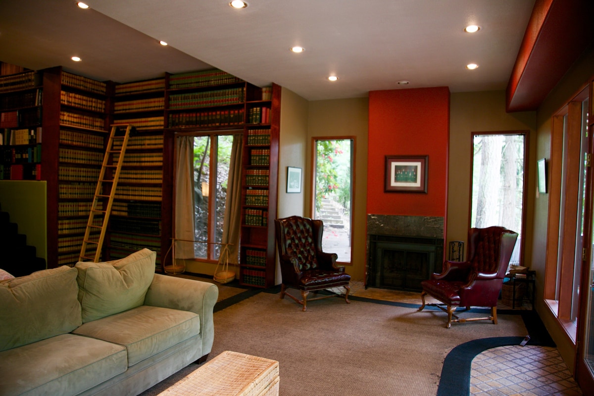 Serenidad, privacidad y comodidad en el exclusivo Eugene South Hills. Ubicada en las copas de los árboles, pero a minutos de la U de Oregón/centro de la ciudad/I-5, esta suite de huéspedes dedicada de más de 900 pies cuadrados de 3 niveles tiene una entrada privada, paredes de ventanas, una chimenea de leña, una bañera de hidromasaje al aire libre, una cama king size, wi-fi, cable/Netflix, auto check-in/check-out, entrada sin llave, nuevo HVAC sin ductos y un masajista disponible. Este es el Airbnb #1 en Eugene utilizado para lunas de miel, escapadas y un video musical.
