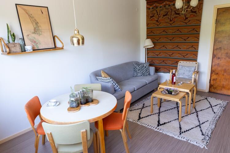 Departamento de un dormitorio recientemente renovado (45 m2) con un dormitorio, sala de estar, cocina pequeña, baño y balcón. Sunila es un suburbio forestal único diseñado por Alvar y Aino Aalto. El departamento se encuentra en una casa con terraza sin ascensor en Päivölä, que se completó en 1939. Se encuentra a unos 13 km del centro de Kotka y a unos 3 km de Karhula. El apartamento ha sido renovado en lo más original posible y está amueblado de forma económica circular, principalmente con accesorios diseñados por Waves. Lavamos los textiles con detergentes inodoros.
