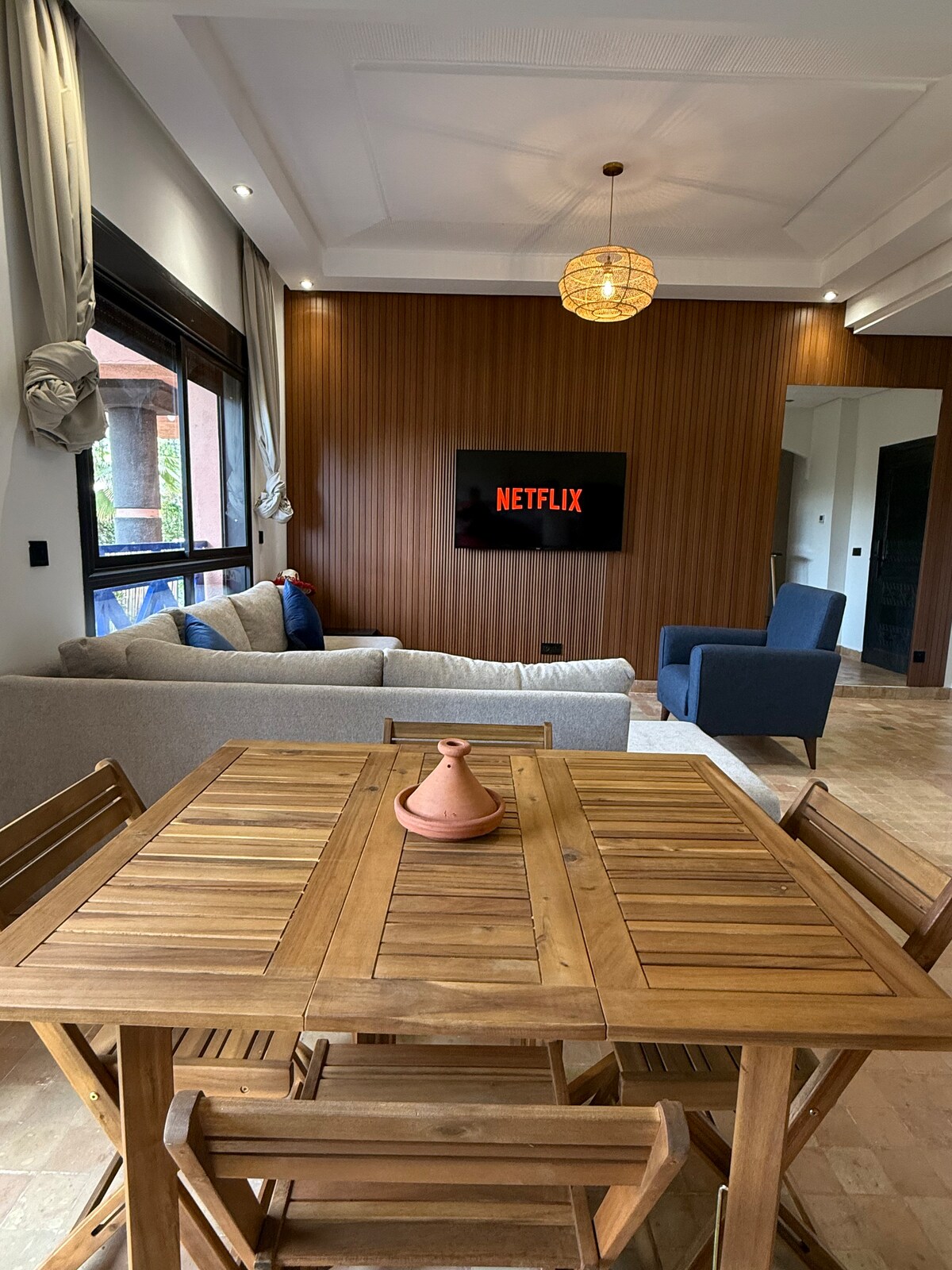 ¡Escápese a un entorno elegante y relajante en Marrakech! Apartamento moderno y acogedor, perfecto para una estancia inolvidable. Sumérgete en la piscina de estilo complejo hotelero y también disfruta de un acceso al parque acuático con 2 piscinas, una de ellas exclusivamente para mujeres y muchas otras actividades para tus hijos Este apartamento cuidadosamente equipado incluye . Un sofá esquinero convertible . Una cocina totalmente equipada Una suite con una cama tamaño Queen Acceso autónomo