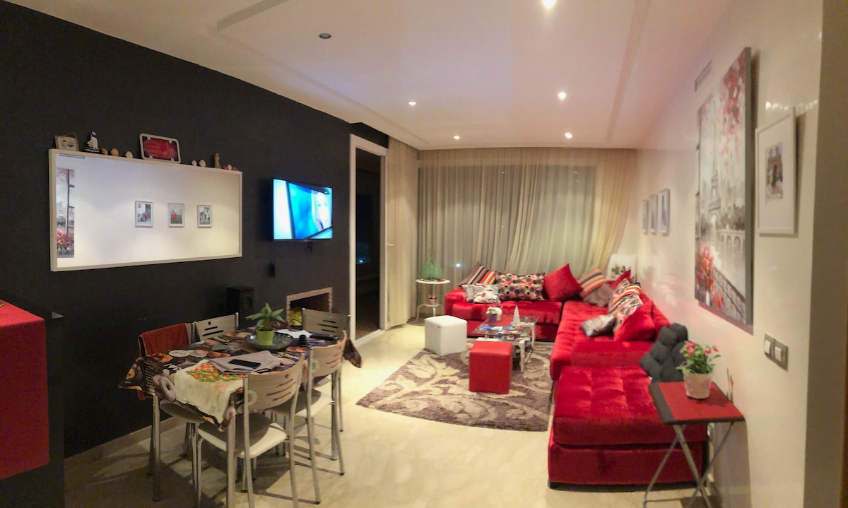 - Emplacement idéal : Entre Casablanca et Rabat, à 5 minute de la plage et 10-min de la gare. - Espaces modernes : Salon confortable avec TV, 2 chambres (1x lit double et 2x lits jumeaux) et cuisine bien équipée. - Vue agréable : Balcon privé donnant sur une piscine, parfaite pour se détendre. - Commodités : Accès à la piscine commune, Wi-Fi gratuit 200 Mbps et parking sécurisé. - Résidence calme : Sécurisée 24h/24 pour un séjour en toute tranquillité.