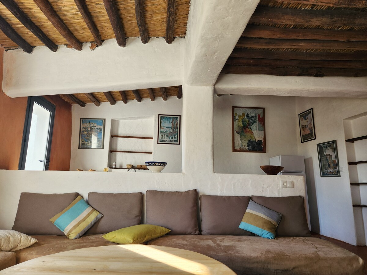 Ubicada en un pueblo rural cerca de Asilah, esta encantadora "gîte" ofrece cautivadoras vistas al mar. Los jardines circundantes traen tranquilidad. Camina hasta las playas de Sidi Mugait y Rada en 30 minutos. Experimenta la vida rural, observa los animales y las nubes a la deriva. Las instalaciones mejoradas garantizan una estadía sin preocupaciones. Nota: No hay wifi y la recepción telefónica es muy limitada (a veces no). Este refugio es ideal para aquellos que buscan desconectarse, relajarse y sumergirse en la naturaleza.