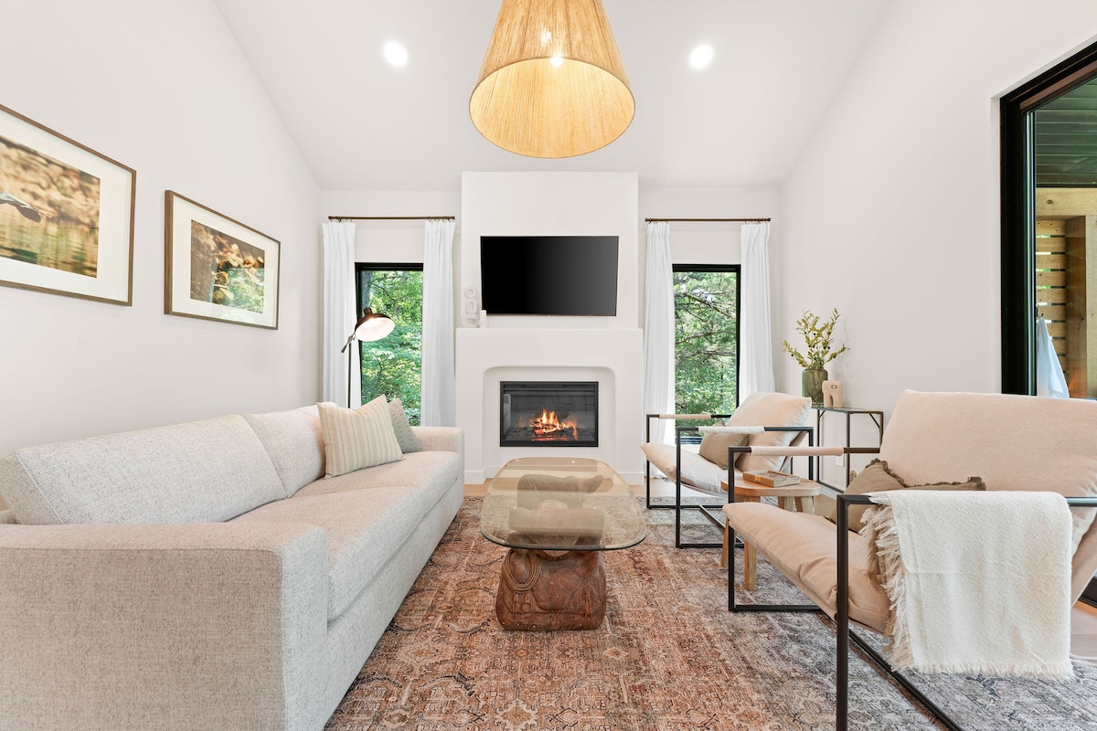 ¡Te damos la bienvenida a The Tree + House en Indian Point! Esta casa del árbol de lujo personalizada fue construida pensando en la comodidad y la relajación. Perfecto para un máximo de cuatro huéspedes, está rodeado de bosque y lleno de luz natural desde las ventanas del piso al techo que muestran impresionantes vistas del lago Table Rock. Te sentirás escondido en tu propio refugio privado, pero aún así estarás a solo minutos del agua y de Silver Dollar City. Es la mezcla ideal de naturaleza tranquila y estilo moderno.
