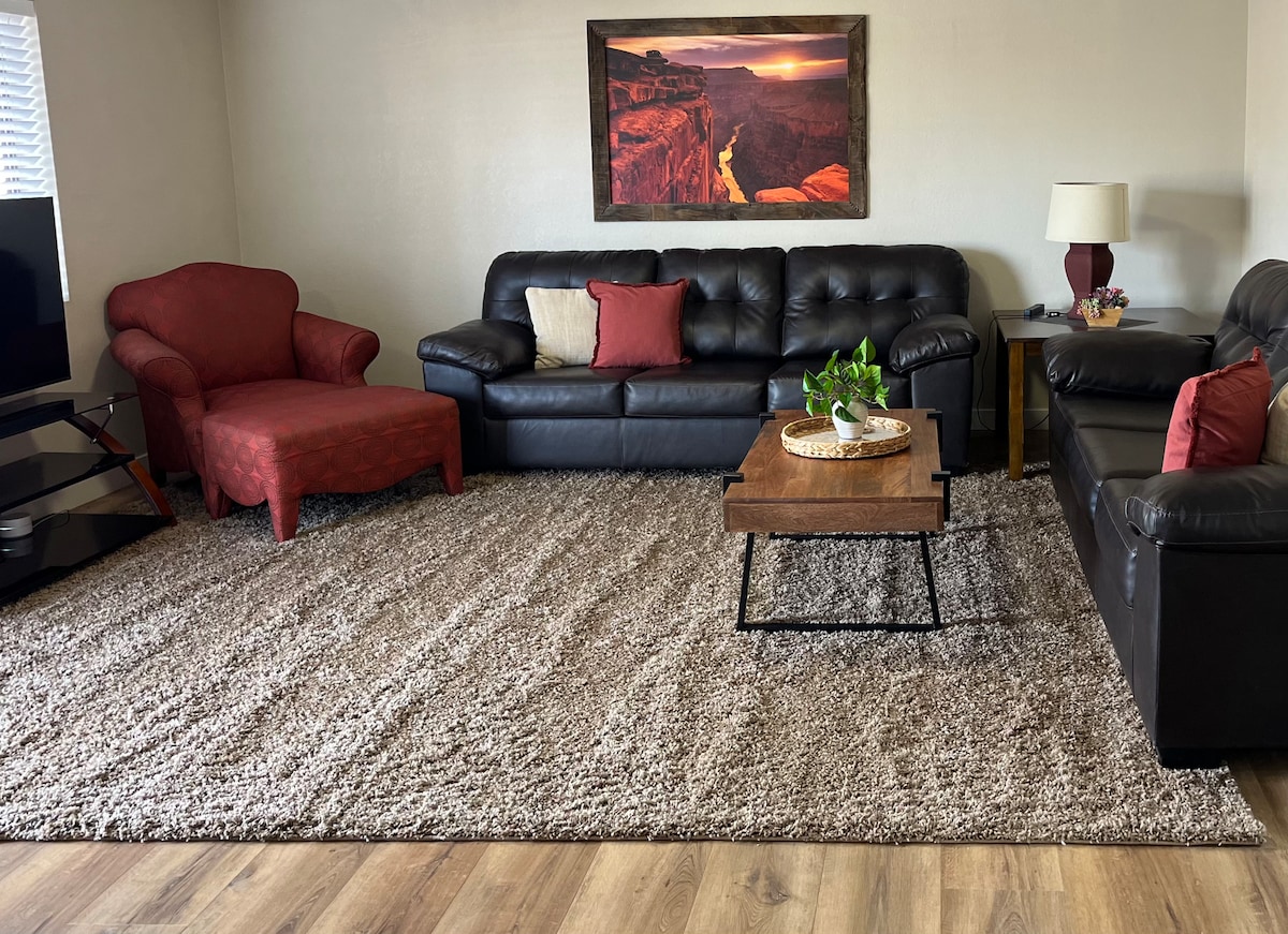 Este dúplex céntrico en Page, Arizona, es fresco, limpio y está listo para ser tu hogar lejos de casa mientras visitas Horseshoe Bend, Antelope Canyon, Lake Powell y mucho más. La casa es un lado de un dúplex de dos unidades ubicado en un barrio residencial seguro y tranquilo a poca distancia a pie de empresas turísticas, restaurantes y el centro de Page. ¿Mencioné que esta casa está a pocos minutos de Horseshoe Bend? El wifi de la casa es muy rápido, funciona con un router Google Mesh con velocidad de descarga de 867 Mbps.
