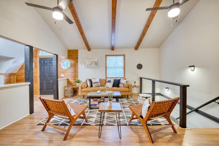 Escápate a The Sparrow, un lujoso A-Frame recién construido ubicado en el valle de Shenandoah de Virginia, a poca distancia en auto de DC. Este moderno refugio cuenta con un diseño de inspiración africana, dos dormitorios, una cocina completa, una chimenea, una bañera de hidromasaje privada, una terraza, un espacio de trabajo, televisores 4K y una PlayStation 5. A pocos minutos de Luray Caverns, Skyline Drive y el Parque Nacional Shenandoah, es la base perfecta para una aventura inolvidable y relajación.