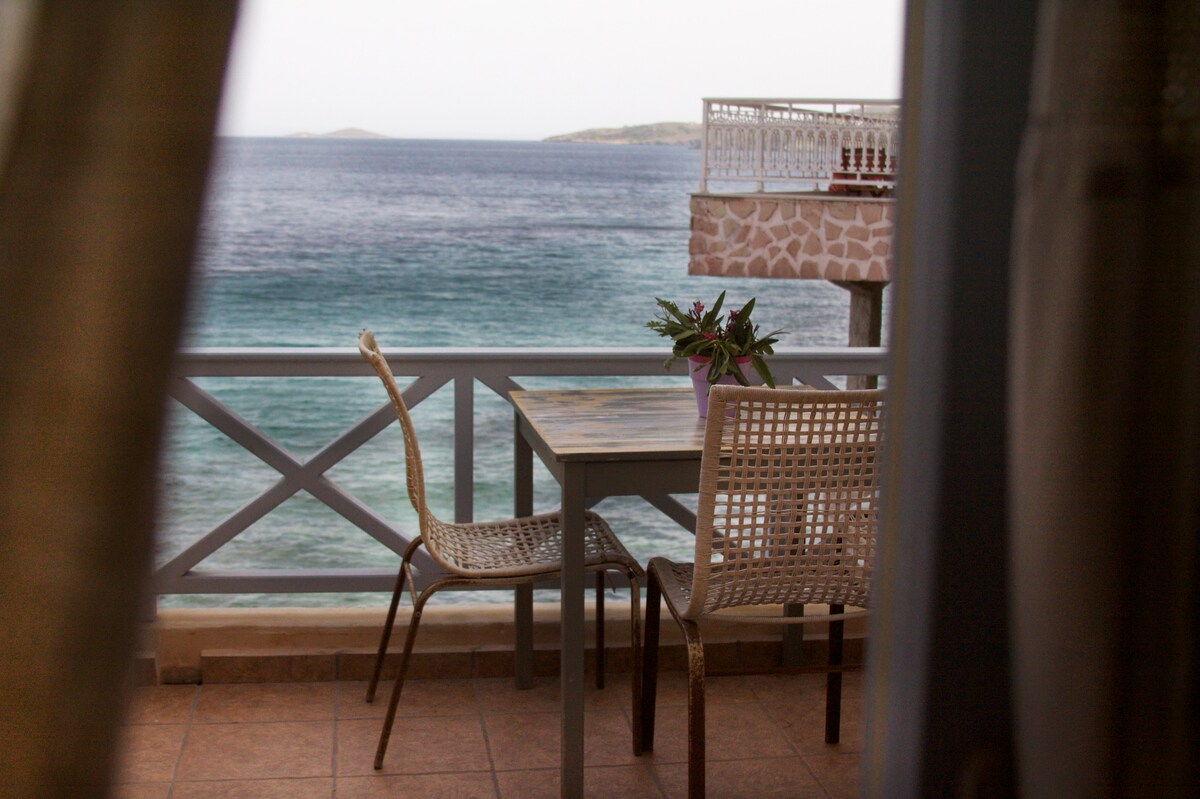Apartamento de un dormitorio totalmente equipado con vistas frontales al mar. Una cama doble en el dormitorio, cocina totalmente equipada (horno, nevera-congelador, lavavajillas, 4 fogones), baño con bañera, lavadora, terraza privada con sillas y mesa. Acceso a un patio compartido con acceso directo al mar (rocas) donde los huéspedes pueden darse un baño por la mañana. Vistas frontales al mar desde la sala de estar y el dormitorio. A pocos pasos del centro de Ermoupolis.