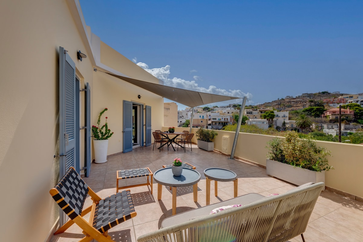 Despiértate en este encantador y luminoso apartamento contemporáneo ubicado en el corazón de Ermoupolis. Este lujoso apartamento recién reformado está bien equipado y situado en el vibrante centro de Ermoupolis, Siros. A solo 100 metros de increíbles restaurantes, cafeterías y bares, también está a pocos pasos de la plaza Miaouli, el puerto de Ermoupolis y el paseo marítimo.