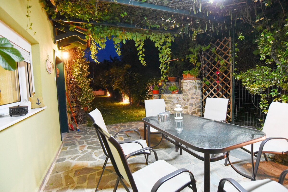 A newly refurnished, spacious house(87sqm) a few minutes away from the beach, with great view and a big, lovely garden. It includes all the amenities and it is also located in a quiet neighbourhood with free parking space and a forest nearby. Kavala town is 8km away and there's a mini market near by as well as plenty of tavernas. The beach is sandy and great for families with young kids.