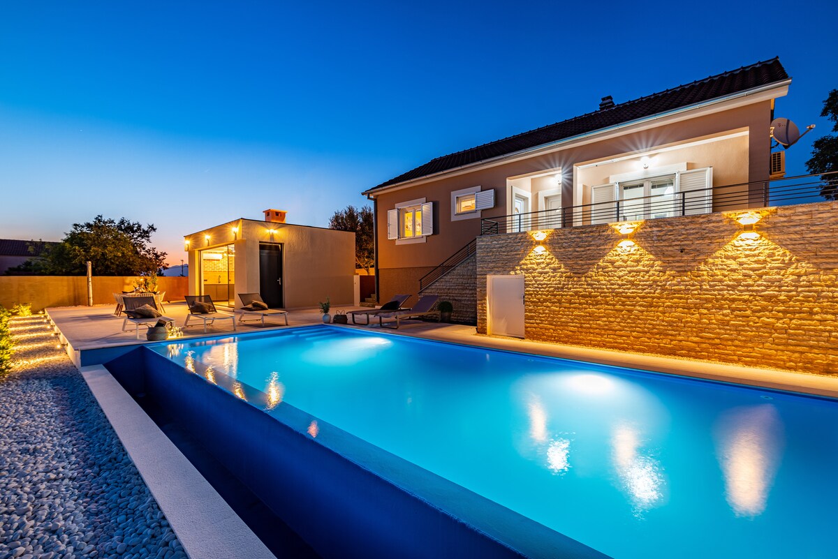 Disfruta de la paz y la privacidad en el pueblo de Donje Biljane, cerca de Zadar. Ideal para familias o grupos más grandes que buscan relajación, al mismo tiempo que desean estar cerca de famosos destinos dálmatas. La propiedad tiene un patio privado cercado. Los huéspedes tienen acceso a una gran terraza al aire libre perfecta para socializar, cenar y relajarse por la noche. Se hace especial hincapié en la piscina privada para refrescarse durante los días de verano.
