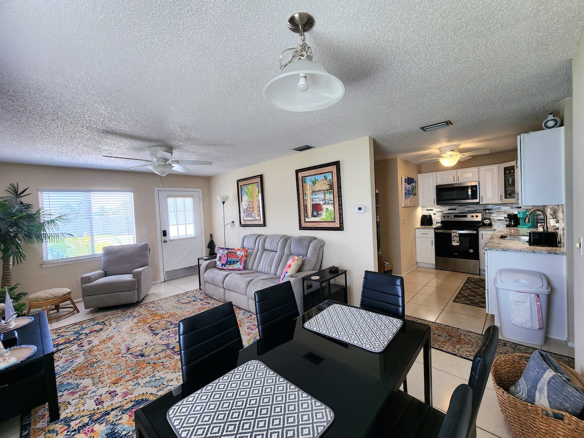 ¡Nuestra comunidad frente al río se encuentra en Cocoa Beach, a unos 3 minutos a pie de la playa! Esta unidad está aproximadamente a 60 pasos del río. Ven y disfruta de las hermosas puestas de sol en el río Banana desde nuestro gran muelle comunitario. Este baño de 2 dormitorios y 1 baño está completamente actualizado, la decoración costera hace de este el lugar perfecto para llamar hogar mientras estás de vacaciones. A solo 2,5 millas del centro de Cocoa Beach. Restaurantes Taco City, Squid Lips, Fat Snook ubicados a pocos minutos en coche. ¡El lugar perfecto para pasar las vacaciones!