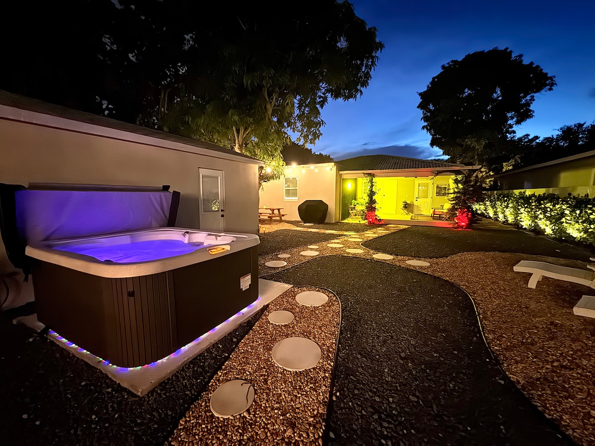 Luminoso y moderno bungalow en Florida con capacidad para un máximo de 6 huéspedes, con dos dormitorios con camas queen y una sala tipo Florida con un sofá cama individual convertible en cama king. Cocina totalmente equipada, amplia sala de estar y un patio trasero privado totalmente vallado con jacuzzi. Sin espacios compartidos, privacidad total. Camina 5 minutos hasta las cafeterías y restaurantes del centro de Lake Worth o conduce 5 minutos hasta la playa. Tu alojamiento perfecto en Florida.