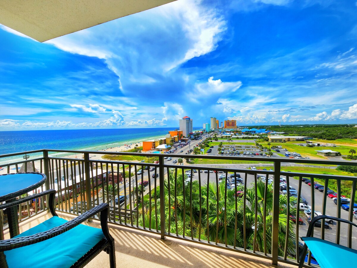 ¡Increíbles vistas impresionantes al mar y a la franja principal! Ubicación perfecta justo enfrente de la playa blanca azucarada y el océano. ¡A solo 15 minutos a pie del famoso Pier Park! ¡Puedes ver fuegos artificiales desde tu propio balcón! Hay varios restaurantes frente a la playa justo al otro lado de la calle. La cocina pequeña totalmente equipada tiene todo lo que necesitas para una estancia cómoda. ¡Acomoda hasta 4 huéspedes! **Hallazgo raro: ¡CHIMENEA en el alojamiento/Estacionamiento gratuito/Registro de entrada autónomo/Piscina climatizada/Jacuzzi!