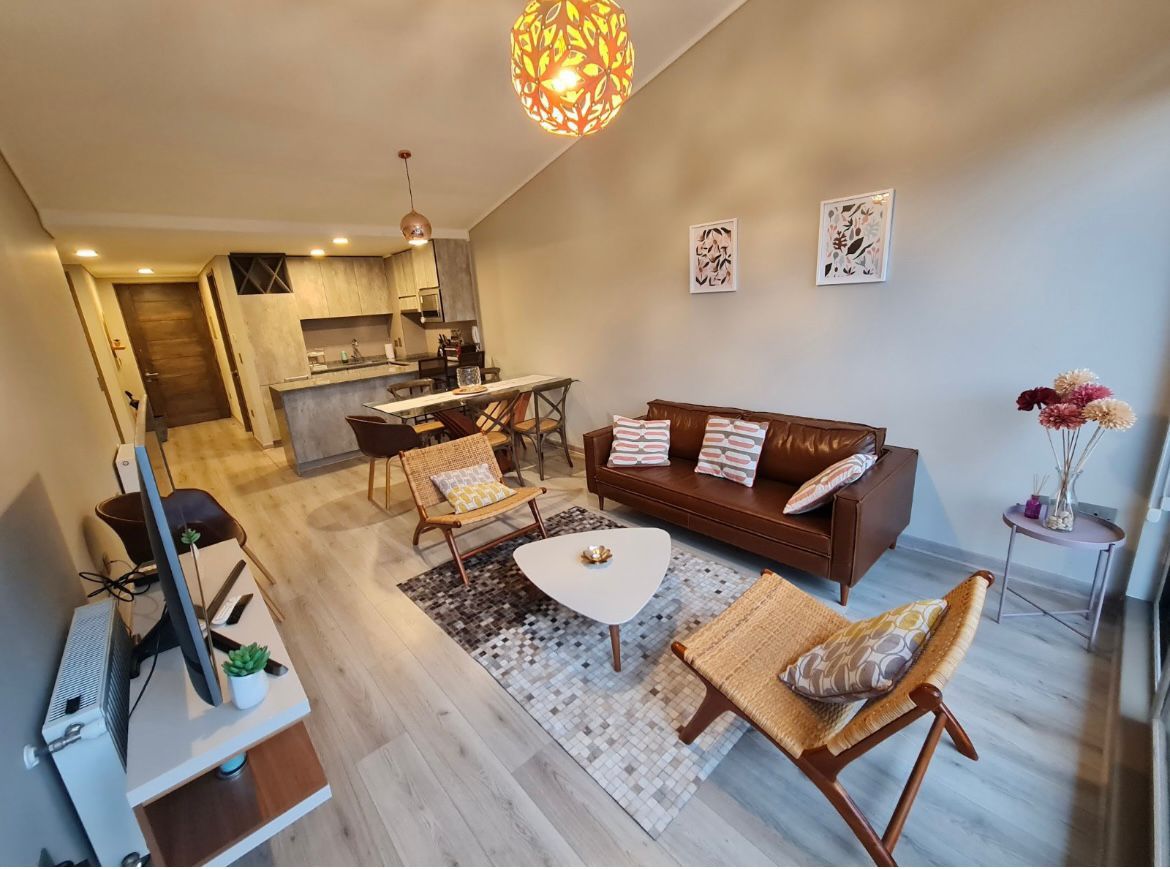 Nuevo y acogedor estudio en la mejor ubicación de Pucón, a pasos de playa grande, centro, y aislado del ruido de la calle principal. Cuenta con cama de 2 plazas, un futón de 2 plazas, cocina full equipada, baño completo, WiFi, TV 49" con Netflix, Disney+ y más, terraza, calefacción, parrilla, cafeteras, 2 bicicletas de uso ilimitado, entre otros. Estacionamiento público frente al acceso al edificio disponible. Incluye ropa de cama, toallas, e insumos básicos de baño y cocina para cada estadía.