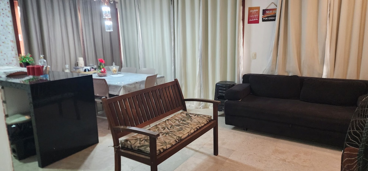 Apartamento dentro de um condomínio fechado. Localizado a 2 minutos a pá da praia e a 5 minutos da praça central de Paracuru. Onde você encontra restaurantes e comércios. O apartamento é amplo (72m2), arejado e bem iluminado com grandes janelas. Foi completamente reformado em 2016. A sala de estar possui sacada com vista para o jardim. Roupa de cama, toalhas, WIFI e estacionamento inclusos no preço da diária. Condomínio com um pequeno Jardim.