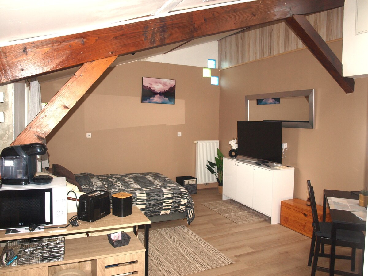 Estudio cálido y moderno, perfecto para parejas o profesionales que viajan. A 2 minutos de la autopista A46, se llega a Lyon, Villefranche o al aeropuerto en un abrir y cerrar de ojos, mientras se disfruta de la tranquilidad y la vegetación. Ropa de cama cómoda, cocina equipada, Wi-Fi rápido, Netflix y llegada independiente. Estacionamiento gratuito en las inmediaciones. Un lugar práctico y cálido, entre la ciudad y la naturaleza.