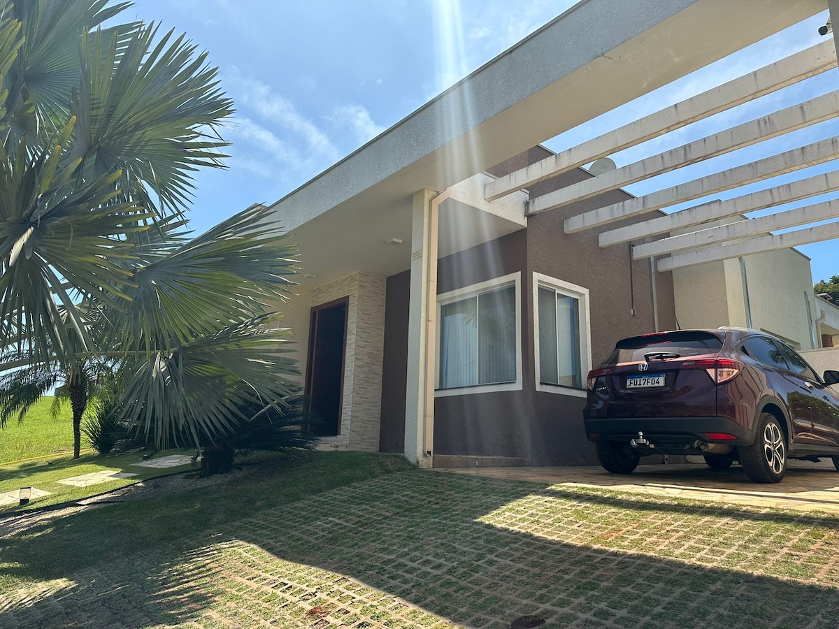 Casa de campo completa en el condominio cerrado más grande y mejor estructurado del interior de SP Espacio acogedor rodeado de flores y mucha naturaleza. 3 cómodas habitaciones (1 suite con aire acondicionado) 2 baños, lavandería, cocina completa y planificada Barbacoa, horno y estufa de leña. Clubes con piscinas, sauna, sala de juegos (billar, ping-pong, amplio espacio para niños), restaurante, redes, slackline, parque infantil, pistas (baloncesto, voleibol, tenis, fútbol) ¡Consulte el acceso, reserve con antelación!