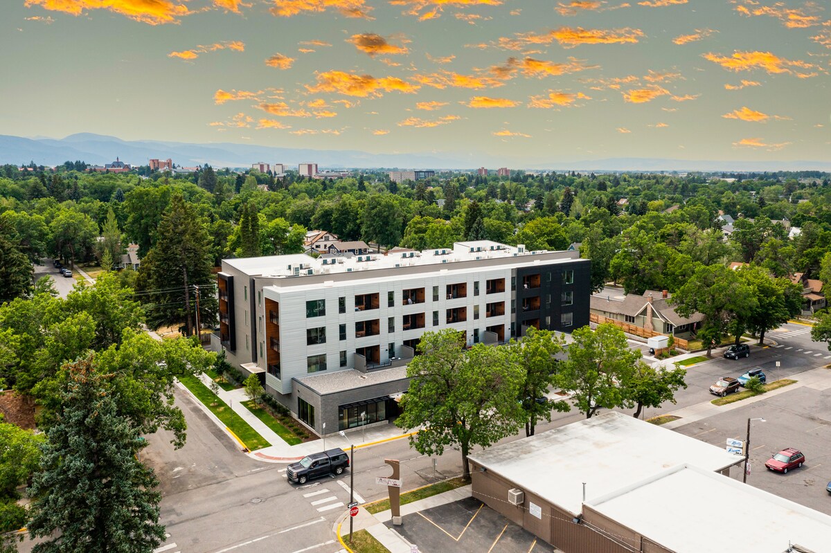 Elegante y moderno apartamento en el segundo piso en el centro histórico de Bozeman; vistas a las montañas Bridger; acogedora sala de estar con TV inteligente; dormitorio con cama tamaño king y TV inteligente; segundo dormitorio semiprivado con cama tamaño queen; cocina totalmente abastecida; baño con ducha a ras de suelo; amplio balcón privado con asientos al aire libre y gran parrilla de gas; tu propia lavadora y secadora en el alojamiento; a poca distancia de la MSU; a solo unas manzanas de excelentes bares, restaurantes de propiedad local, tiendas y lugares de entretenimiento; plaza de aparcamiento subterráneo reservada.