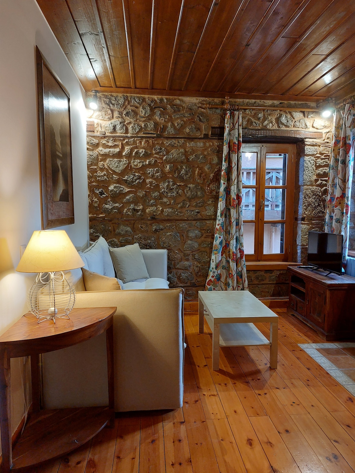 Traditional wood and stone apartment with a beautiful view to the village and the mountains of the area. The apartment is within walking distance (300m) from the main road. It can accommodate up to 6 people, offering a double bed in the bedroom, two sofas which can be converted into beds in the living room, and a bunk bed in the hall. The kitchen is fully equipped with coffee filter machine and toaster. Moreover, there is a separated bathroom and a restroom.