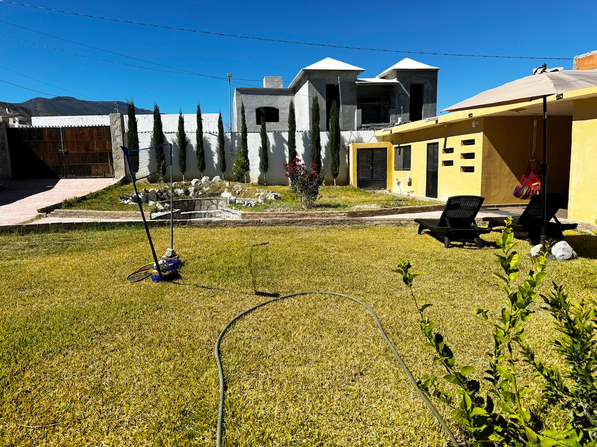 Descubre el encanto de Parras desde un alojamiento con ubicación privilegiada. Estamos frente a la Alameda y a solo unos minutos caminando de la plaza principal. Nuestra casa es ideal para grupos grandes o familias (hasta 10 personas). Dispone de tres espaciosas habitaciones con baño completo en cada una, además de un medio baño. El alojamiento también cuenta con una pequeña palapa y cochera con espacio para dos vehículos. Estoy a tu disposición para ayudarte a que tu estancia sea inolvidable.
