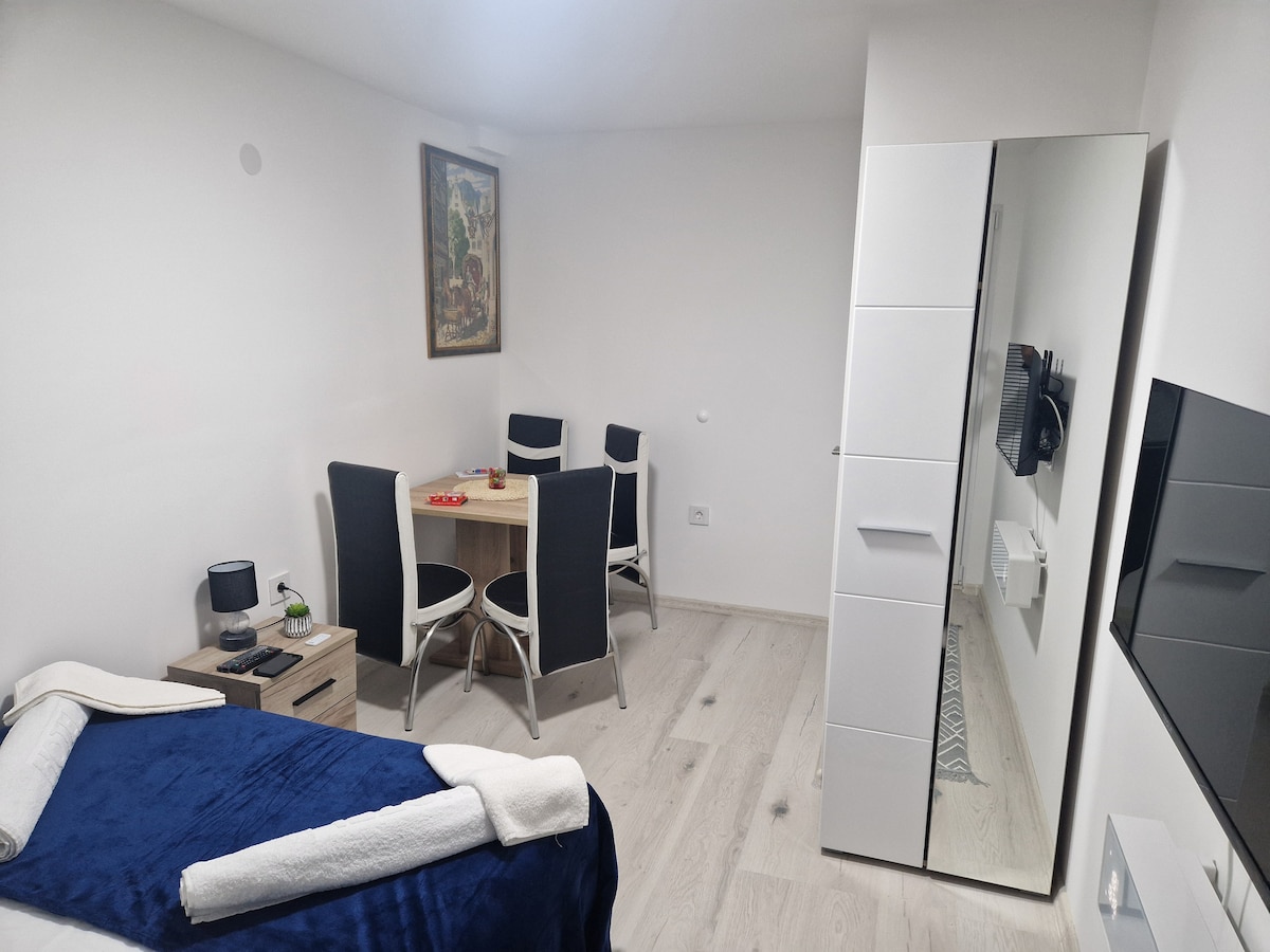 Nuevo apartamento moderno de dos habitaciones con un dormitorio, 55 m2, en el centro de la ciudad (calle principal-zona peatonal). Ideal para parejas, personas solas, viajeros de negocios y parejas con hijos. Puede alojar cómodamente hasta 3 personas. El apartamento tiene un dormitorio grande con cama de matrimonio y terraza, baño con ducha, cocina totalmente equipada, sala de estar con tres asientos, 2 sillones, TV inteligente y balcón francés. Aire acondicionado, calefacción por suelo radiante, aparcamiento. Nota: El apartamento está en el segundo piso, ¡el edificio no tiene ascensor!