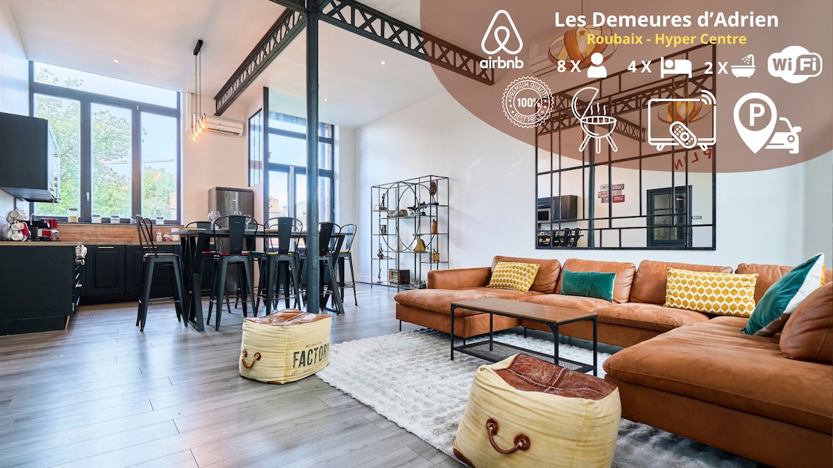 ✨ Bright 250 m² loft located in the heart of Downtown Douai, perfect for up to 6 guests — ideal for both leisure stays and business trips. 📍 Prime location, just steps from shops, restaurants, and historic landmarks. 🌇 Spacious 50 m² rooftop terrace, ideal for relaxing or enjoying a drink outdoors. 🛋 3 bedrooms, large living area, fully equipped kitchen, modern bathroom — comfort and space guaranteed.