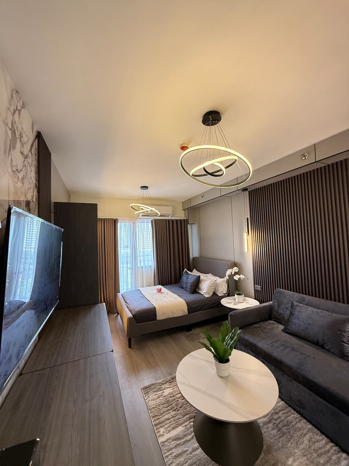 Acogedora unidad de estudio en esquina a solo 5 minutos de la Terminal 3 de NAIA y Runway Manila. Disfruta de un espacio luminoso con vistas al aeropuerto, una cómoda cama, TV inteligente con Netflix gratuito y WiFi rápido. Los huéspedes también tienen acceso gratuito a la piscina, el gimnasio y el parque infantil, por lo que es perfecto para escalas, escapadas rápidas o estancias en la ciudad.