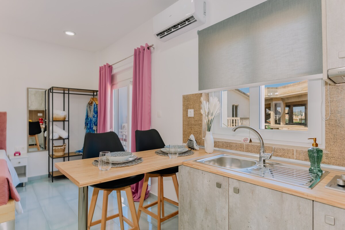 Απολαύστε την απόλυτη χαλάρωση σε αυτό το κομψό και πλήρως εξοπλισμένο στούντιο με μαγευτική πανοραμική θέα στη θάλασσα. Το διαμέρισμα διαθέτει ένα άνετο διπλό κρεβάτι και καναπέ-κρεβάτι, ιδανικό για να φιλοξενήσει έως 3 άτομα. Η ιδιωτική αυλή με σαλόνι εξωτερικού χώρου σας προσκαλεί να απολαύσετε τον καφέ ή το κρασί σας με θέα το απέραντο γαλάζιο. Ιδανικό για ζευγάρια, φίλους ή οικογένειες που αναζητούν πολυτελή διαμονή με άνεση και στυλ, μακριά από τον θόρυβο της πόλης.
