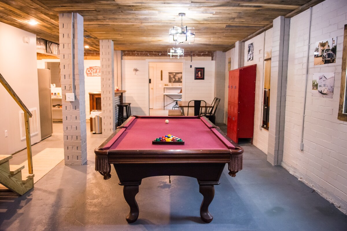 Welcome to your home-away-from-home! This space is a downstairs level of a brick home and has a loft like feel with unique industrial decor & an indoor bed swing! The pool table is a perfect way to end the day with friends. You won’t find another space like this! Pets are welcome and the fee is $50 per booking. This is a smoke-free home.