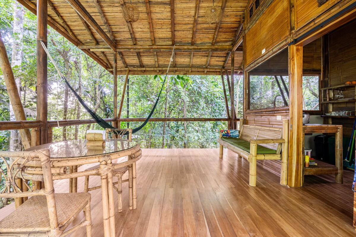 Disfruta de Pura Vida en un nuevo y exclusivo alojamiento ecológico de bambú. Amplio dormitorio bien ventilado con cama tamaño king y precioso altillo con cama tamaño queen. Disfruta del baño al aire libre con vistas a la naturaleza. Observa tucanes y monos en la selva desde el amplio balcón privado mientras te relajas en una hamaca. Practica yoga en una plataforma de yoga privada de bambú mientras admiras la vista del océano al fondo. Camina por el sendero privado hasta la cascada de la propiedad para nadar y relajarte bajo el sol en privado.