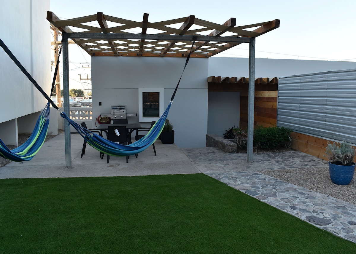Bienvenido a nuestro departamento de un dormitorio de estilo industrial recientemente remodelado con una piscina increíble, a 3 cuadras de la playa. Nuestro alojamiento es un loft único, de estilo abierto, con ladrillos a la vista y obras de arte impresionantes. Una base ideal para explorar Puerto Peñasco. Cocina moderna con mostradores de hormigón, cafetera y todos los electrodomésticos nuevos. Incluye wifi y zona de estacionamiento cerrado. El loft tiene una cama tamaño queen y un pequeño sofá cama en la sala de estar. ¡Cerca del bar Pitaya, la playa de Manny y Alcapone Pizza!