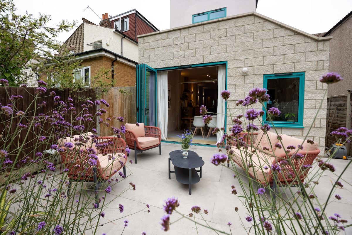 Encantador y vibrante apartamento cerca de Crystal Palace Park, lleno de luz solar y con un amplio jardín, nuestro pequeño oasis en el corazón de Londres. Con dos acogedoras salas de estar, abre las puertas del jardín e invita al aire libre. Soy chef, mi marido es músico y nuestra familia de artistas tiene su trabajo exhibido con orgullo en todo el espacio. En tren de 25 minutos a London Bridge, Victoria o Waterloo. ¡4 estaciones de tren cercanas y el autobús a Trafalgar Square sale fuera de la puerta principal!