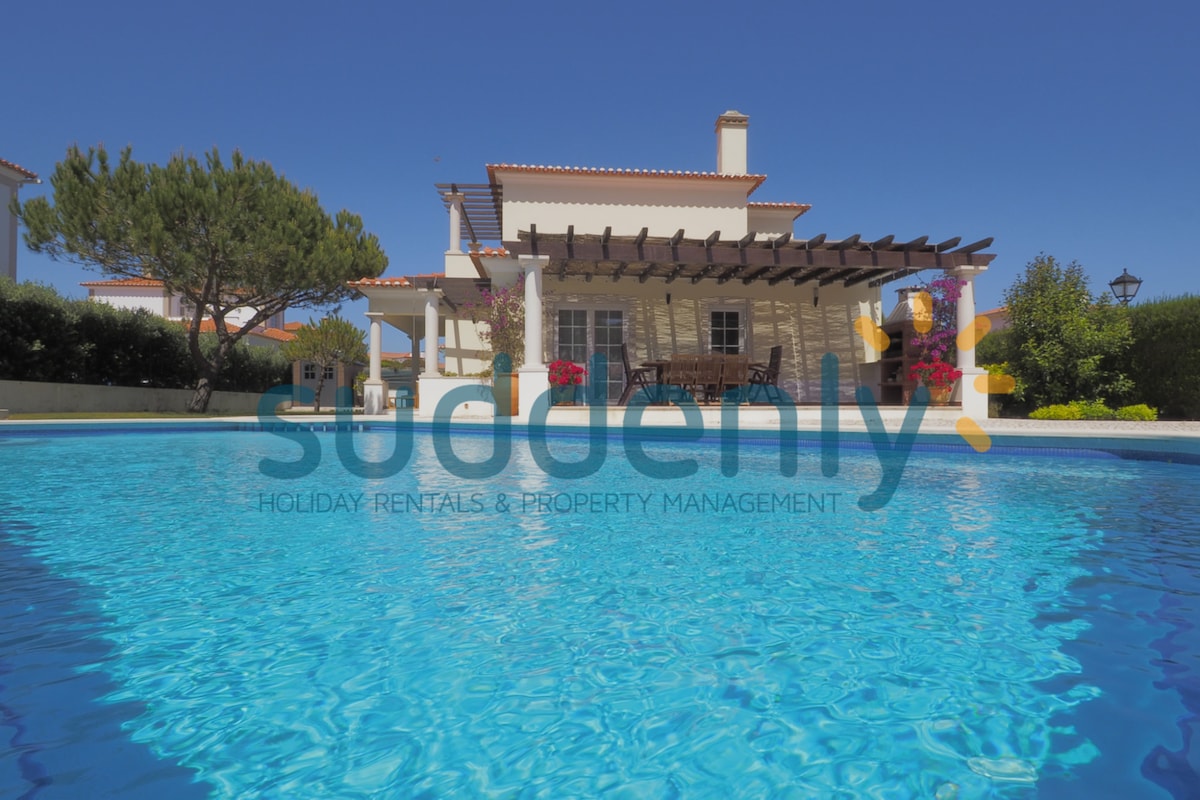 Villa en expansión lujosamente diseñada y decorada situada en un acre de hermosos pastizales con árboles altos que rodean la piscina y la casa de la piscina. Extremadamente aislado y privado, con mucho espacio para un grupo grande, especialmente familias con niños. A dos minutos a pie se encuentra la playa que cuenta con algunos de los mejores surfistas de Europa. Muy cerca hay cuatro campos de golf de campeonato; Praia D'el Rei Country Club, West Cliffs, Bom Successo y Royal Obidos, los cuatro están clasificados en el Top 100 europeo.