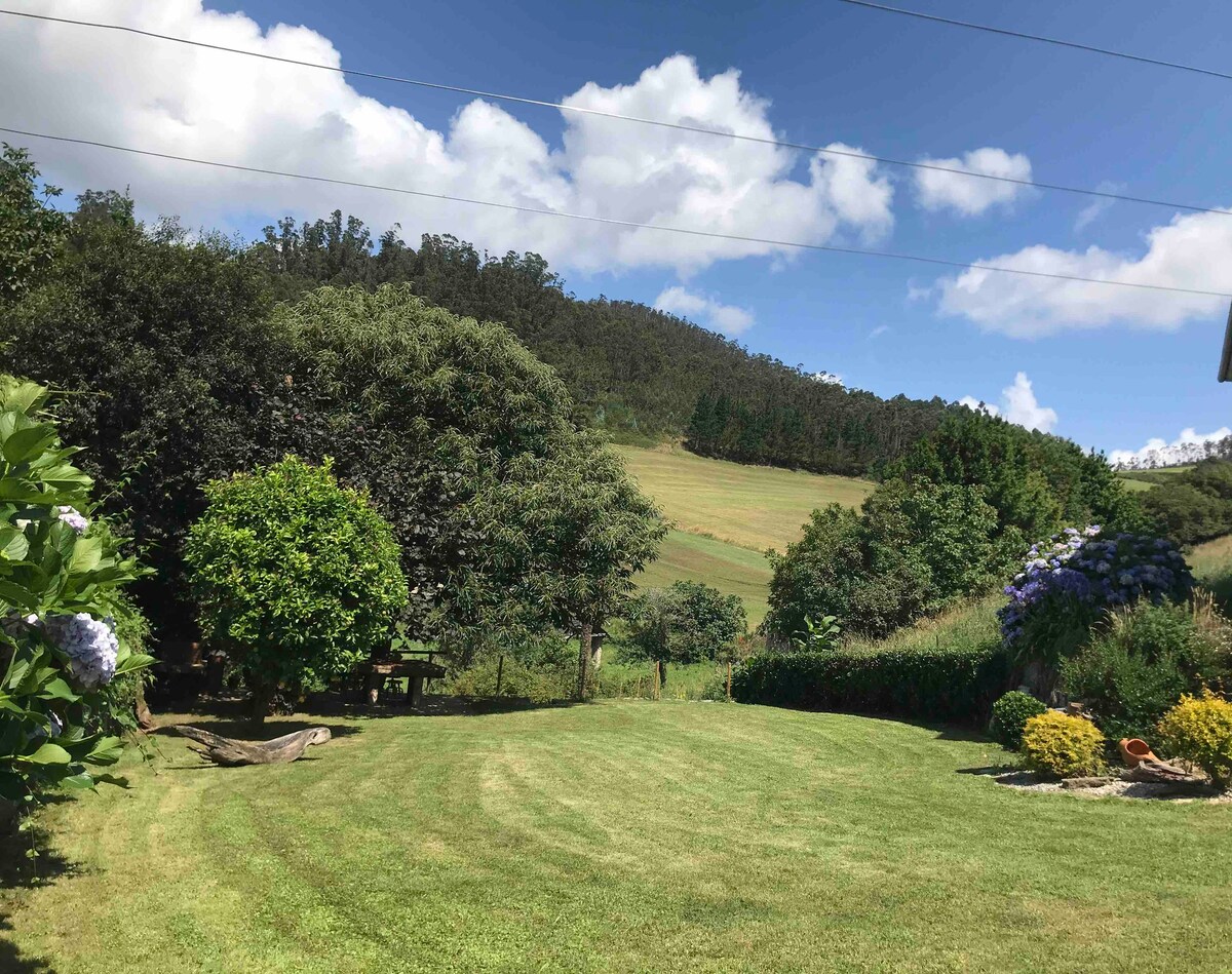 Alojamiento de gran luminosidad y confort, decorado con un mural y cuadros marinos, obras de la propietaria del alojamiento. Se respira una paz absoluta, la casa está rodeada de un jardín independiente de 200m² con un cierre seguro, ideal para alojarte y disfrutar con tu perr@,Rodeada de verdes prados está situada a 1 km del centro de Ribadeo (10 minutos andando) a 8 km de la playa de las Catedrales, a 50 m del Camino Norte de Santiago y a 50 m podrás ver su bellísima Ría.