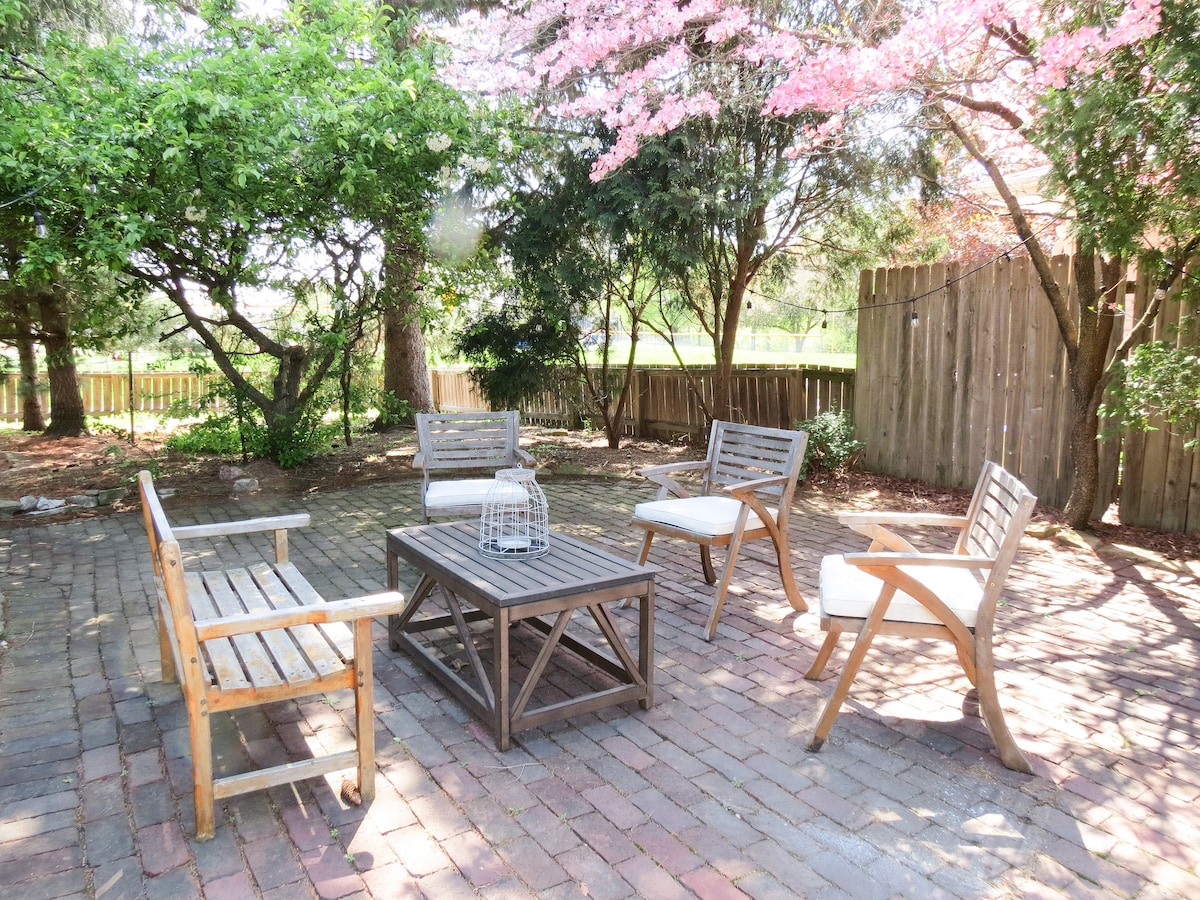 Hermosa casa de campo ubicada en una calle sin salida. ¡Un verdadero oasis cerca de todo! Tres dormitorios tienen camas tamaño queen de alta calidad. Hay dos baños completos. Uno tiene una bañera de hidromasaje profunda. El otro tiene una gran ducha de vapor de azulejos. La cocina está equipada con todos los elementos esenciales para cocinar y nuevos electrodomésticos de acero inoxidable. También disfrutarás de la gran terraza, que tiene muebles cómodos debajo de un cenador, mesa de bistró y sillas para dos y parrilla de gas Weber.