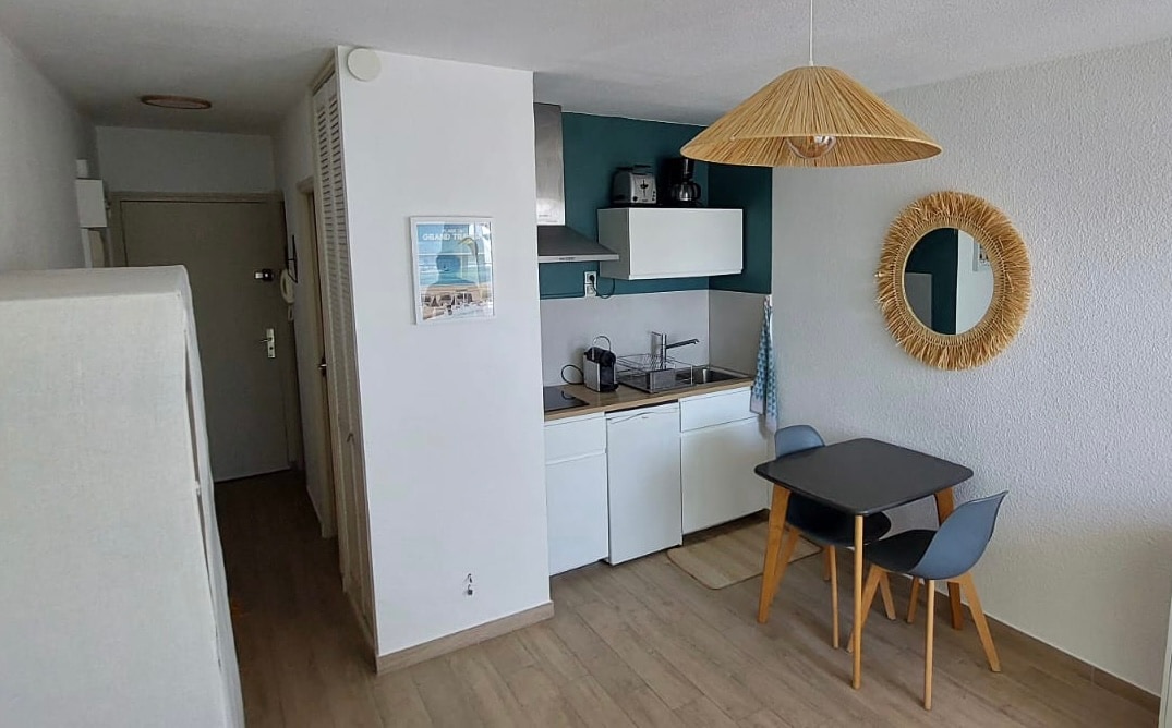 Entre el puerto y la playa, estudio amueblado para 2 personas completamente renovado, en el séptimo y último piso de una residencia con 2 ascensores Sala de estar con sofá cama, para la noche se han instalado cortinas opacas (sin persianas) Cocina equipada y equipada: placa de inducción de 2 fuegos, nevera, cafetera Senseo, microondas. Cuarto de baño con inodoro, ducha, lavadora 🅿Plaza de aparcamiento privado incluida, lo que es esencial para su tranquilidad en temporada de verano Espacio para bicicletas compartido disponible