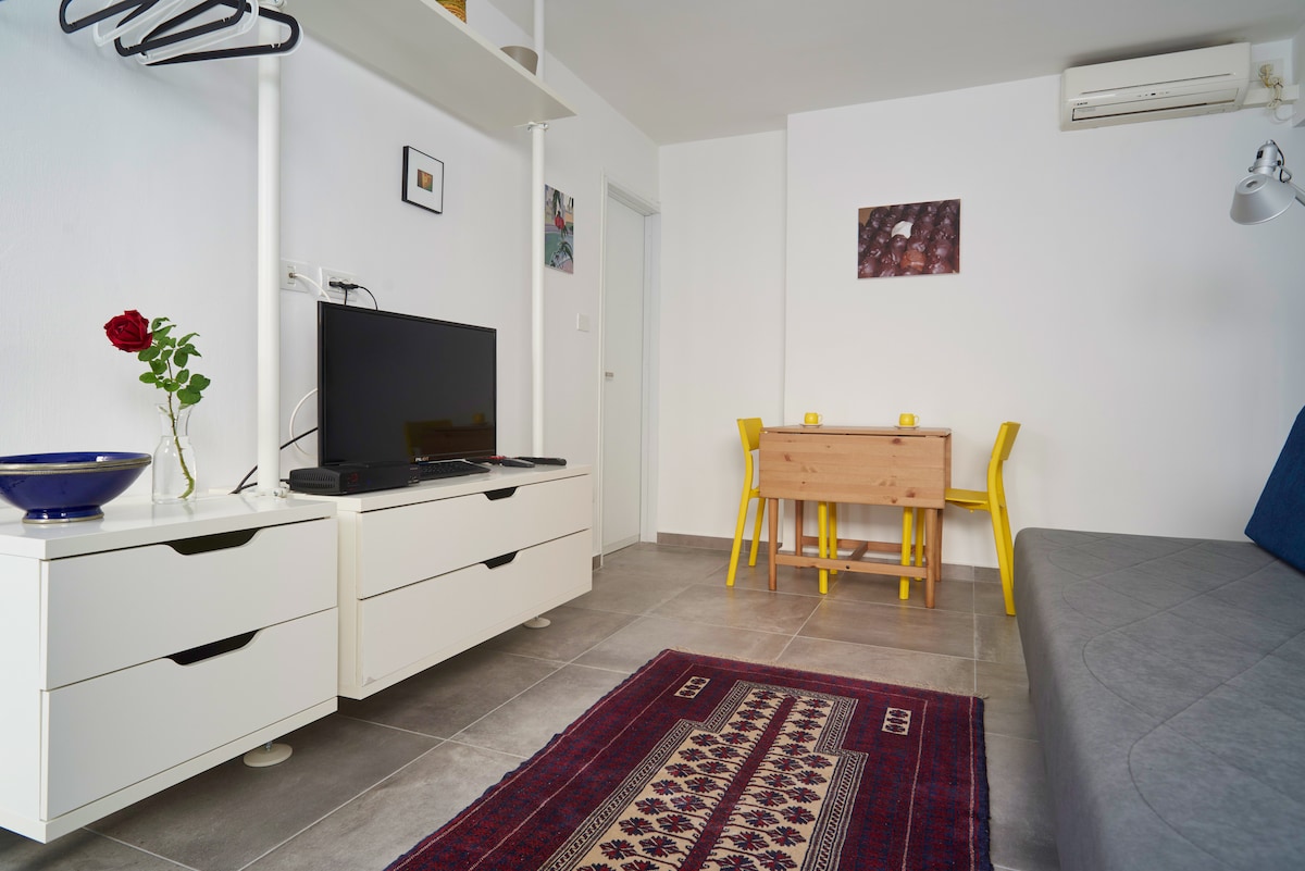 Un apartamento estudio renovado. Situado en el centro de Herzliya . A 3 minutos a pie del centro. A 10 minutos en coche de la playa. Segundo piso, ascensor. Cocina totalmente equipada (con estufa eléctrica, microondas, nevera, ollas y sartén, cubiertos), inodoro y ducha privados, televisión por cable, armario, cama doble, aire acondicionado, wifi gratuito. Estacionamiento en la base de la toma por orden de llegada.
