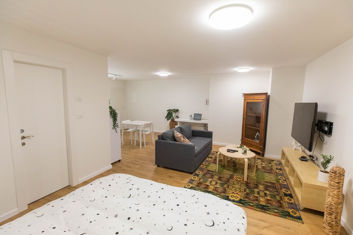 Convertimos un antiguo taller de chocolate en un encantador estudio, moderno, diseñado profesionalmente en colores claros. Es un apartamento estudio. 1 dormitorio solamente. ubicado en un vecindario tranquilo. Recientemente cambiamos el sofá a una cama de tamaño queen. El colchón es de primera calidad. En la cocina tenemos: azúcar, aceite para cocinar, café, sal y azúcar. Los utensilios de la cocina permiten la preparación de comidas ligeras. El departamento no es apto para bebés. Es para una o dos personas.