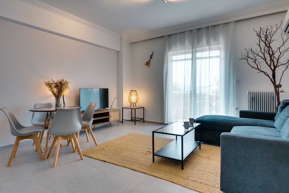 Private patio & fresh air abound in this quiet spacious 60m2 island-style one-bedroom just a 10 min walk to Acropolis! Enjoy urban amenities & freshness in the homey living area & inner courtyard patio. Sleeping up to 4, this bright floor is ideal for couples or friends who want to enjoy the bustling Thisseio neighbourhood & city on foot! A space that truly celebrates the sea with natural accents & tones. Fully air-conditioned from breakfast nook to the spacious queen. 5 min walk to Metro.