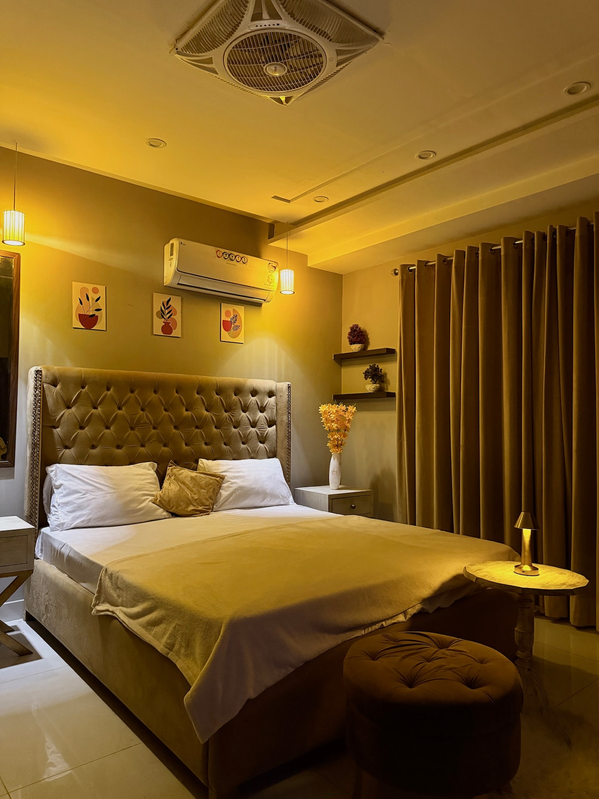 Luxury 1-Bed Apartment | Eiffel View | Staysia Rooms 1 - Eiffel View Balcony for morning coffee 2 - Queen Bed with Floating Lights 3 - 2 Smart LCDs (55” in bedroom) + Netflix 4 - 2 ACs (1 free, 1 optional +PKR 2000) 5 - High-Speed Wi-Fi, peaceful ambiance 6 - Dining for 4, plates & cutlery 7 - Self Check-in/out + Welcome Basket 8 - No parties, drugs, alcohol, or loud music 9 - Stylish décor & professional hospitality 10- Comfortable, cozy and Spacious