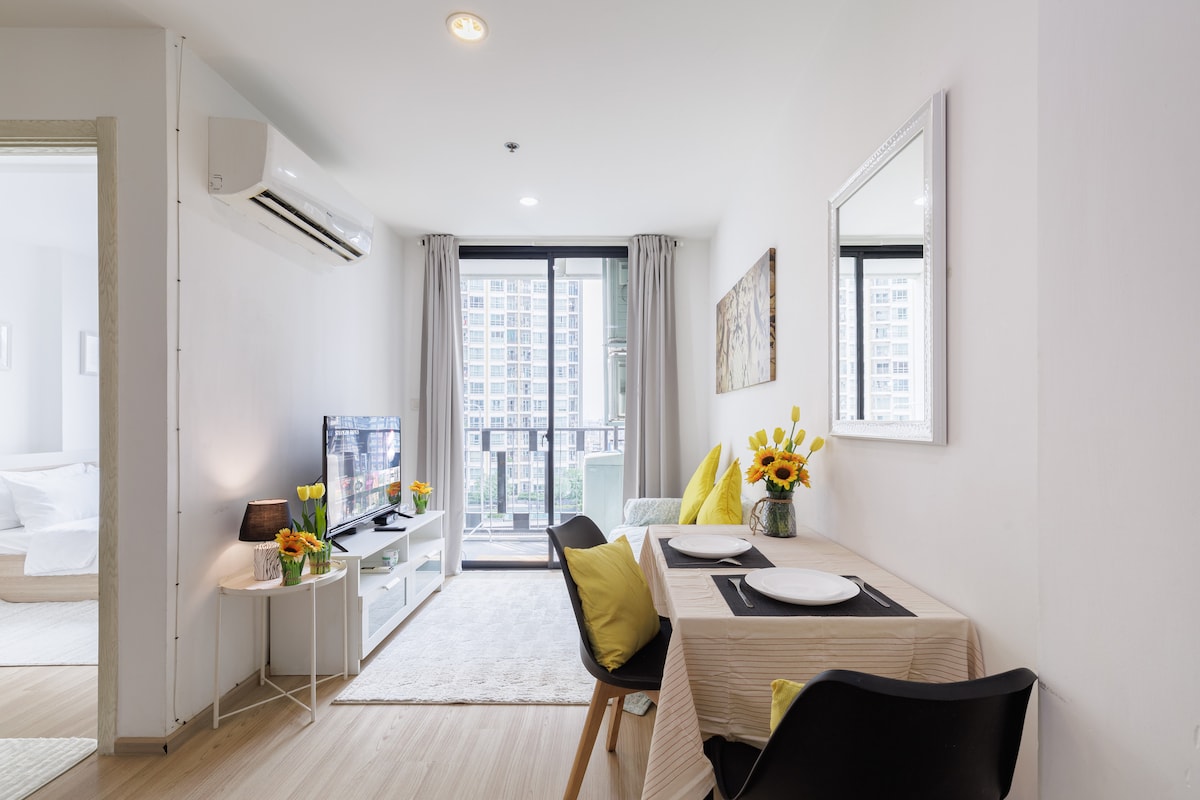 Aspectos destacados de la propiedad Espacio cómodo: 1 dormitorio 1 baño (sofá/sala de estar/mesa de comedor), fácil de acomodar a 2 adultos. Ubicación privilegiada Centro de transporte 1. A solo 300 metros de la estación BTS On Nut (3-5 minutos a pie), acceso directo al centro de la ciudad: 2.1 estaciones al distrito de negocios de Siam (Siam Paragon/MBK/CentralWorld/Siam Square) Acceso directo a Nana Square, centro comercial T21, Four Faced Buddha, centro comercial EM, centro comercial Gateway, terminal de autobuses Ekkamai, Central Embassy 3. Traslado de BTS a MRT, acceso rápido al mercado nocturno del tren 4. Conveniente para conducir: a 200 metros de la entrada de la autopista, a 500 metros de la salida de la autopista (salida On Nut) Instalaciones de vida (a poca distancia) Comedor: 7-11 abajo, cafetería, bufé Best Beef (junto a la casa) Supermercado: Lotus Supermarket (300 m), Big C Supermarket (500 m) Entretenimiento: rodeado de una amplia variedad de restaurantes y locales de vida nocturna. Transporte conveniente e instalaciones de vida todo en uno para satisfacer las necesidades de viajes de negocios y vacaciones de placer, ¡es una base ideal para explorar Bangkok!