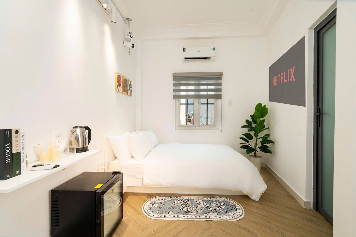 Elegante estudio en el Distrito 3, a solo 10 minutos del Distrito 1. Amplia sala de estar, baño moderno, cocina compartida (24/7). Servicio de limpieza diario (8:00 a. m. a 8:00 p. m.), lavandería gratuita y estacionamiento para motocicletas incluidos. Rodeado de excelentes restaurantes y tiendas de conveniencia. Perfecto para un máximo de 3 huéspedes que buscan comodidad, estilo y ubicación en el corazón de Saigón.