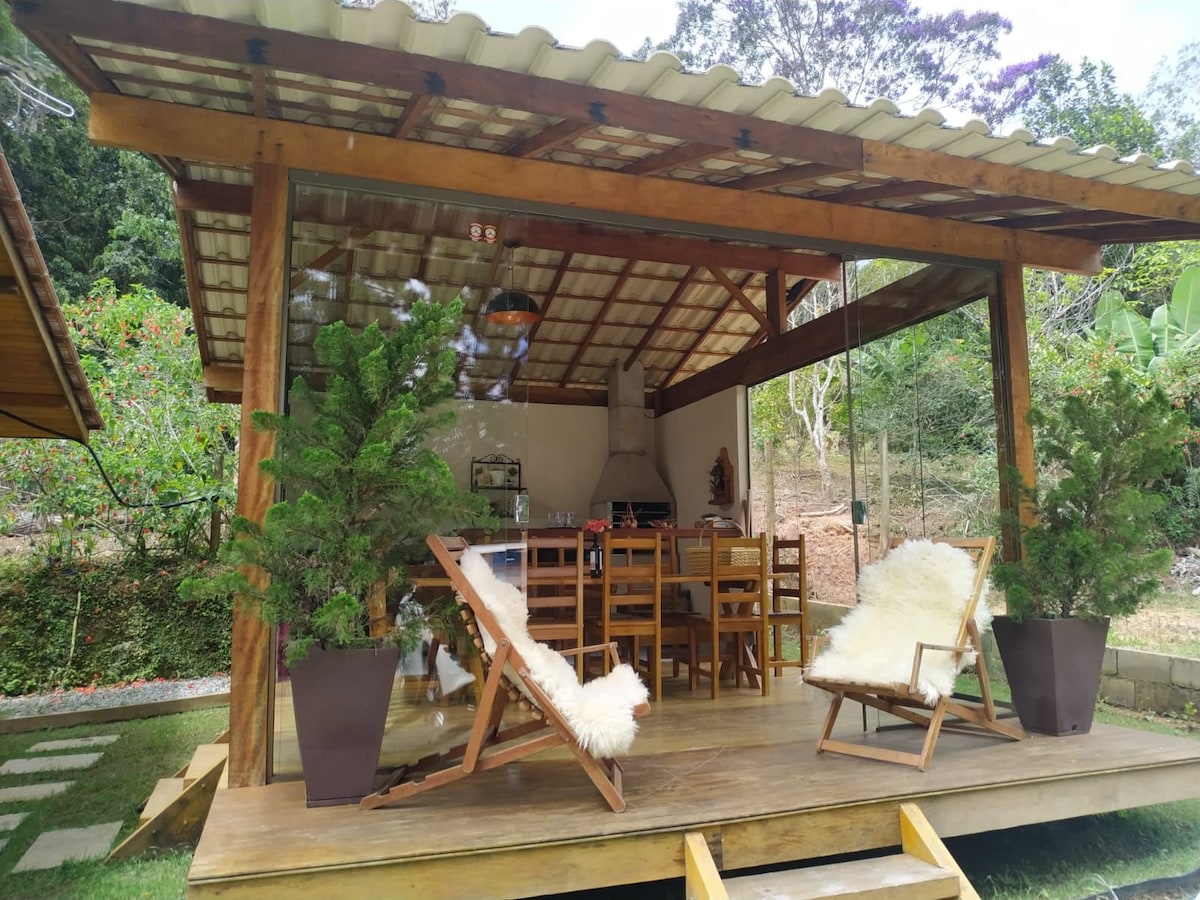 Relájese en este espacio tranquilo y elegante. Con una vista espectacular en medio de la naturaleza, el sonido del río y las aves. Discreto y acogedor. En el agradable clima de las montañas de Capixabas. Ven a vivir momentos increíbles en este maravilloso rincón.