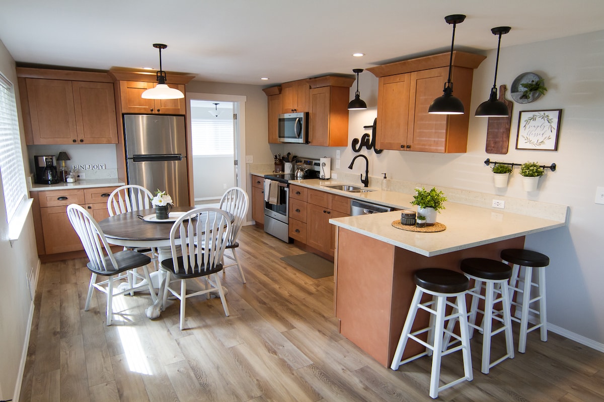 Acogedor oasis frente al río en el centro de Puyallup, perfecto para relajarse o explorar. Interior - Sala de estar de planta abierta con chimenea de roca de río y candelabro de asta. - Cocina del chef completamente equipada para cocinar en serio - 2 dormitorios cómodos, ropa de cama de calidad hotelera Exterior - Jacuzzi de agua salada para 4 personas. - Patios cubiertos, barbacoa y fogata en el borde del agua. - Camina a restaurantes, Riverwalk Trail y mercado de agricultores; a 30 minutos de Sea-Tac, a 1 hora de Mt Rainier.