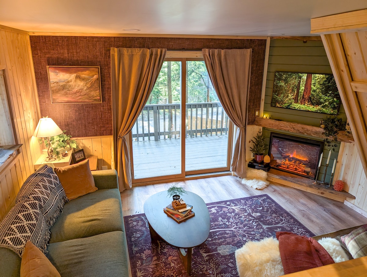 Ubicada en una ladera, Owl's Outpost se siente como una casa del árbol enclavada entre imponentes árboles de hoja perenne. Las amplias escaleras conducen a este acogedor refugio, cuidadosamente diseñado para la comodidad. La cocina está totalmente equipada y la sala de estar cuenta con una chimenea eléctrica, un acogedor rincón de lectura, juegos y un tocadiscos. Arriba, encontrarás un dormitorio encantador con una cama tamaño queen y una oficina con un espacio de trabajo. En el exterior, disfruta de un spa en el bosque con sauna, jacuzzi para 2 personas y una fogata bajo las estrellas.