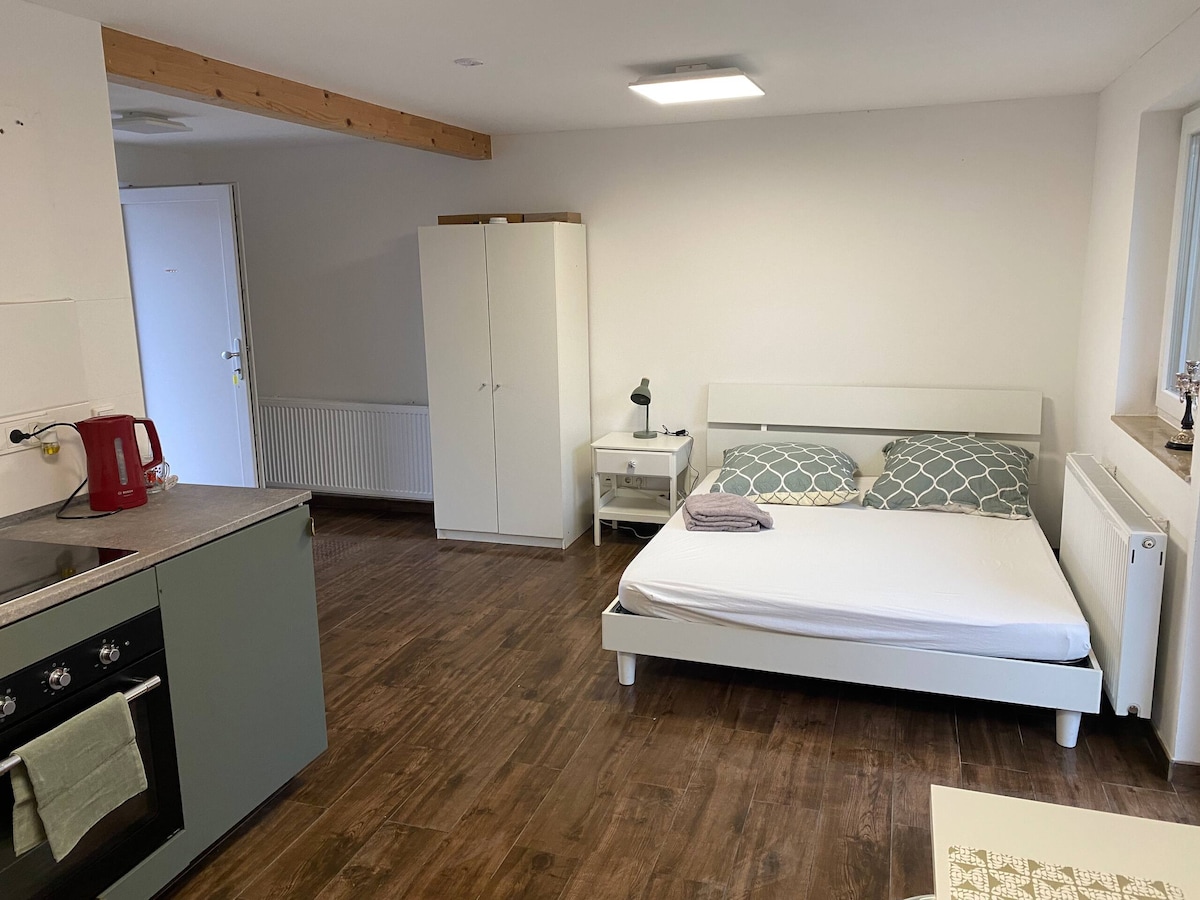 El departamento se renueva regularmente. Los muebles de roble y materiales naturales para una buena conciencia y la alegría de la comodidad te dan el marco para una estancia relajante. Tienes tu propia entrada y puedes desayunar o asar en tu propia terraza cuando el clima lo permita. Por supuesto, tenemos una cocina totalmente equipada con microondas y cafetera Nespresso. La televisión es obligatoria y para las personas analógicas entre ustedes, una biblioteca está a su disposición.