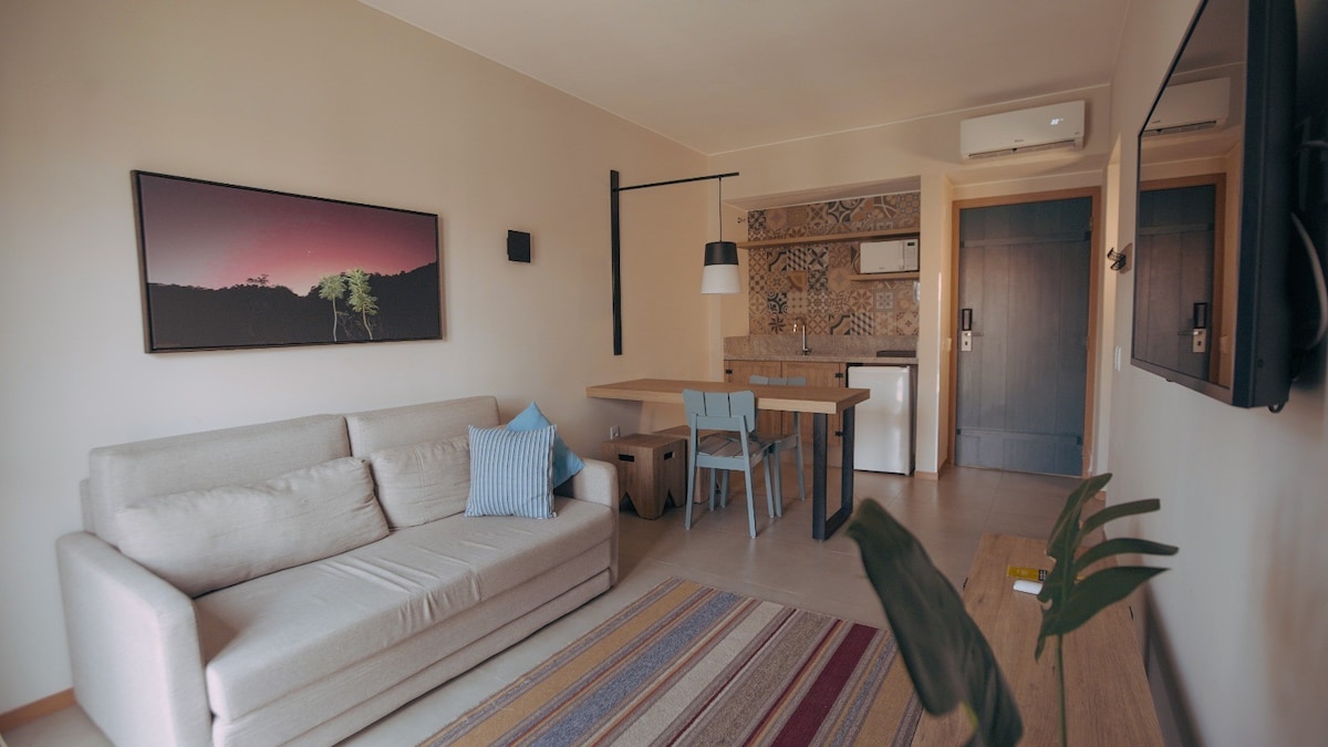 ¡Nuevo apartamento de un dormitorio con cama queen, ventilador, arara/maleiro; amplia sala con dos camas, tv/parabólica; un baño, cocina completa, área de servicio y un balcón con hamacas frescas para descansar! Ventilador en la sala. Estacionamiento con portón electrónico. ¡Barrio noble, privilegiado, tranquilo y seguro! En la calle de los Flats hay una panadería y un supermercado. Opciones para caminar y hacer ejercicio en la plaza del barrio a dos cuadras 300 m. ¡Apartamento limpio con camas/colchones de calidad!