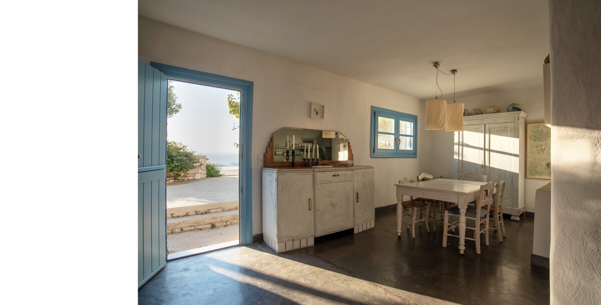 Nuestro punto de referencia es el mar, el aura que emana el lugar y la luz cicládica. Etherio se encuentra en una colina, de ahí su característico nombre. Desde nuestros apartamentos disfrutarás de las vistas al pueblo de Piso Livadi, a la pequeña iglesia tradicional de Agios Nikolaos y a los mágicos reflejos de color del horizonte marítimo que se extiende hasta la isla de Naxos, una auténtica «ventana al Egeo». Nadie puede resistirse a la vista de las Cícladas con las alteraciones de la luz desde el amanecer hasta el atardecer.